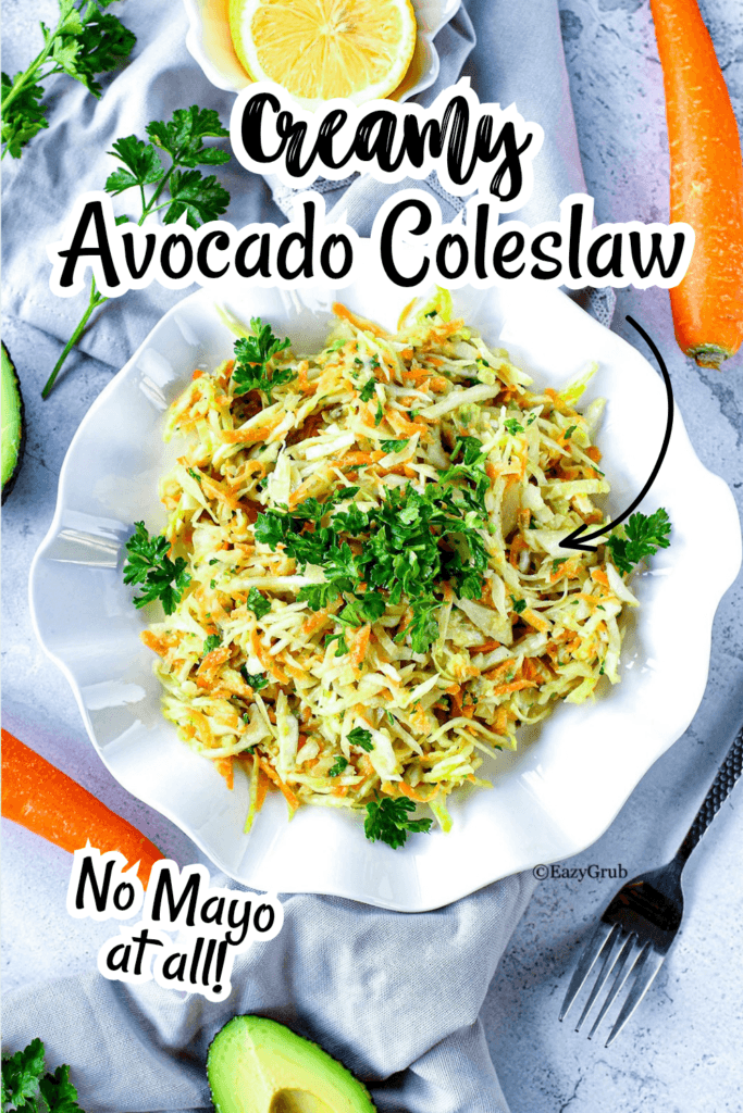 This creamy avocado coleslaw is a quick no-mayo slaw made with fresh avocado, lemon, and simple pantry ingredients. Light, creamy, and ready in just 15 minutes.