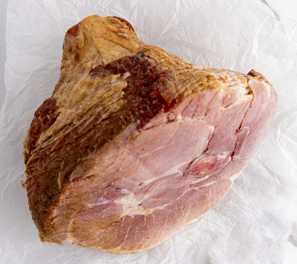 Pressed/Formed Boneless Ham is the type we’re using. This ham is usually smaller, boneless, and in a log or football type shape. When they’re made, they’re wrapped in a netting that gives them indentations on the outside when cooked at the plant, and they are almost always sold fully cooked. They run about 1.5kg (roughly 3 lbs), are inexpensive, and are absolutely perfect for this recipe.
