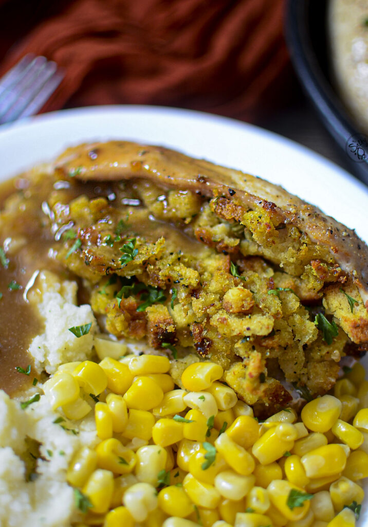 Freezer: Freeze cooked stuffed chicken breasts individually with any sides to make a ‘Frozen Dinner’. I like to freeze the gravy separately and then reheat and drizzle over top. I find if you pour it over then freeze, when it reheats, it absorbs into the food.